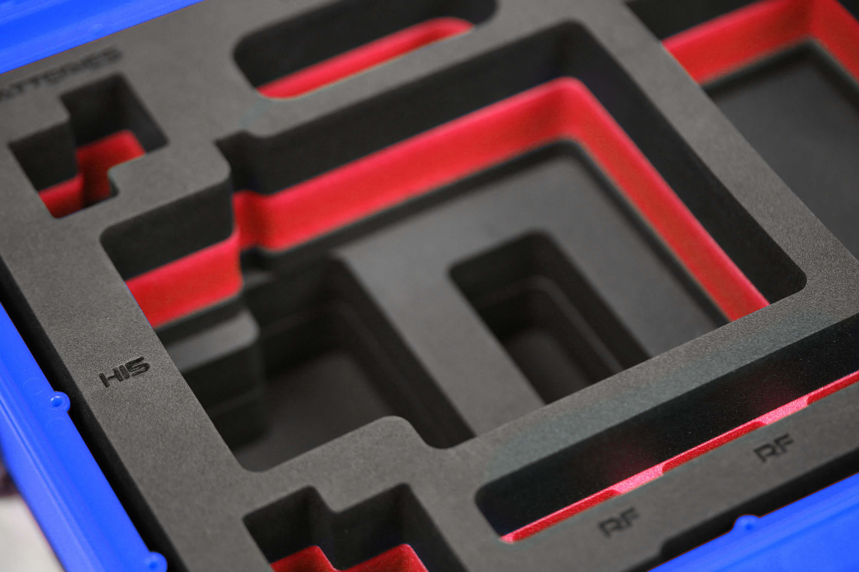 Close view of Black Color ARRI HI-5 Carry-On Case with Red Layer Custom Foam Insert